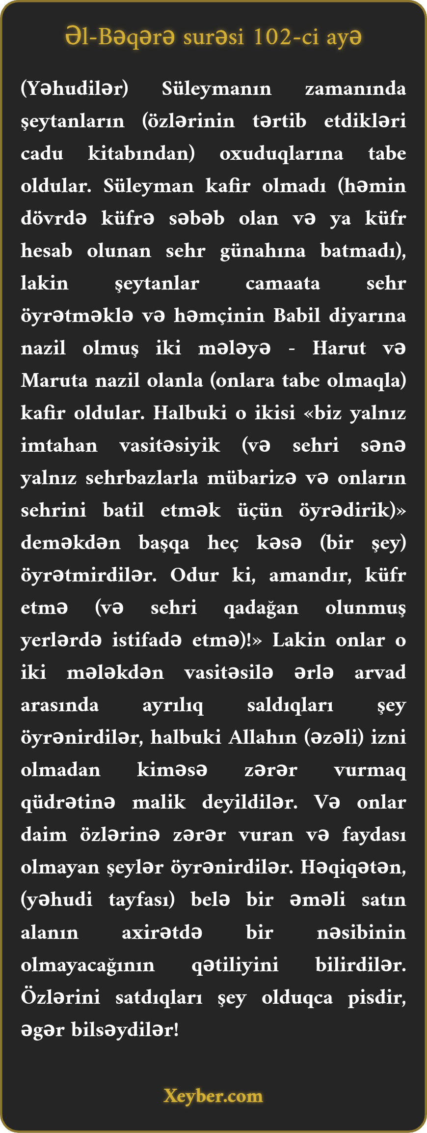 "(Yəhudilər) Süleymanın əsrində şeytanların oxuduqlarına tabe olurdular. Süleyman heç vaxt kafir olmadı. Amma şeytanlar xalqa sehr-cadu öyrətməklə kafir oldular. Babil şəhərində Harut və Marut adlı iki mələyə nazil olanlara tabe oldular. O iki mələk əvvəlcə "Biz sizin imtahan vasitənizik”, "kafir olmayın” deməmiş kimsəyə bir şey öyrətmədilər. Amma onlar bu iki mələkdən elə bir şey öyrəndilər ki, onun vasitəsi ilə ərlə arvad arasına ayrılıq sala bilsinlər. Amma Allahın iradəsi olmadan heç vaxt kimsəyə zərər toxundura bilməzlər. Onlar o hissələri öyrəndilər ki, özləri üçün xeyiri yox, ziyanı oldu. Şübhəsiz, bilirdilər ki, hər kəs belə şeylərin alıcısı olsa, axirətdə bəhrəsi olmayacaq. Doğrudan da, özlərini çox pis bir şeyə satdılar. Əgər bilsəydilər!”