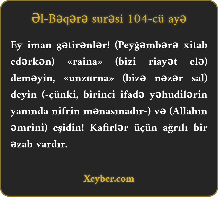 "Ey iman gətirmiş kəslər! (Peyğəmbərə) "raina” deməyin "unzurna” deyin ("bizi nəzərdə saxla," bu tövsiyəni) eşidin və kafirlər üçün dərdli əzab var.”