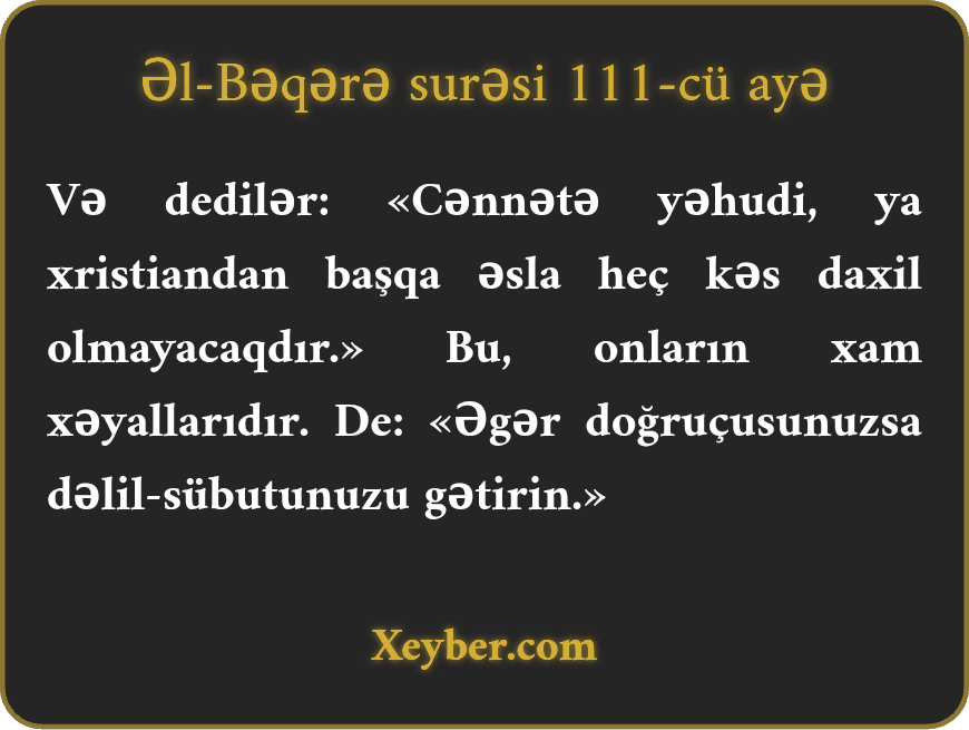 "Dedilər: Yəhudi və məsihi olmayınca heç kim behiştə daxil olmaz. Bu, onların arzusudur. De ki, əgər doğru deyirlərsə, öz dəlillərini gətirsinlər.”