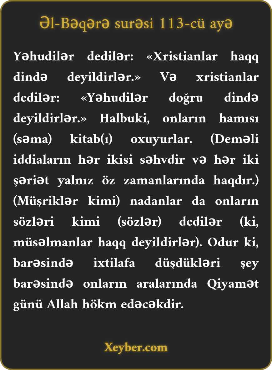 "Yəhudilər dedilər: "Məsihilər haqq deyil." Məsihilər isə belə dedilər: "Yəhudilər haqlı deyil." Hansı ki, onlar səmavi kitab oxuyurlar. Eləcə də digər nadanlar onlar kimi danışdılar. Allah qiyamət günü onların arasında ixtilafda olduqları şey haqqında mühakimə yürüdəcək.”