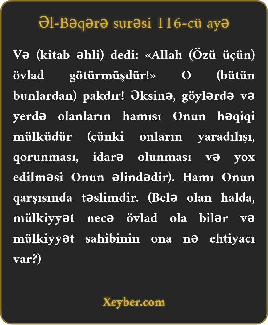 "(Kitab əhli və müşriklərdən bəziləri) dedilər: "Allah özü üçün övlad götürmüşdür.” O, (bu sifətdən) münəzzəh, pakdır. Göylərdə və yerdə olanlar Onundur. Hamı Onun qarşısında itaətdədir.”