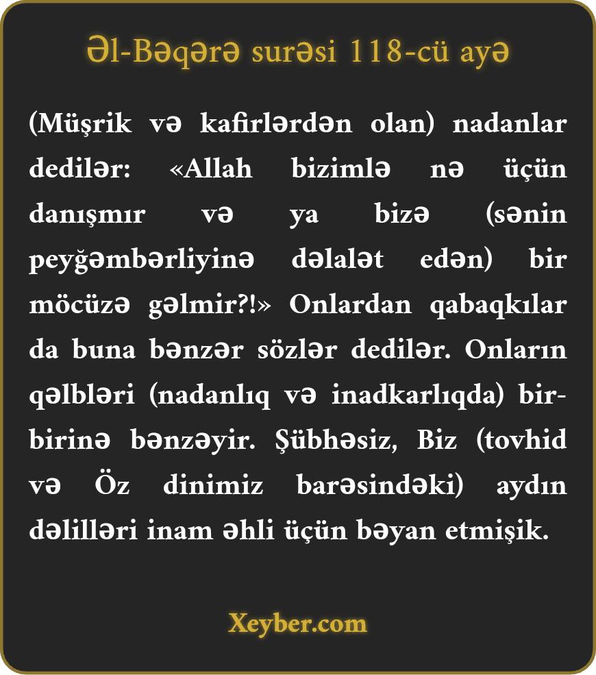 "Bilməyənlər dedilər: "Nə üçün Allah bizim özümüzlə danışmır? Nə üçün bizim özümüzə bir ayə və nişanə gəlmir?” Onlardan qabaq olanlar da onlar kimi danışırdılar. Onların qəlbləri oxşardır. Amma Biz yəqin əhli (həqiqəti axtaranlar) üçün aydın ayə və nişanələr qərar vermişik.”