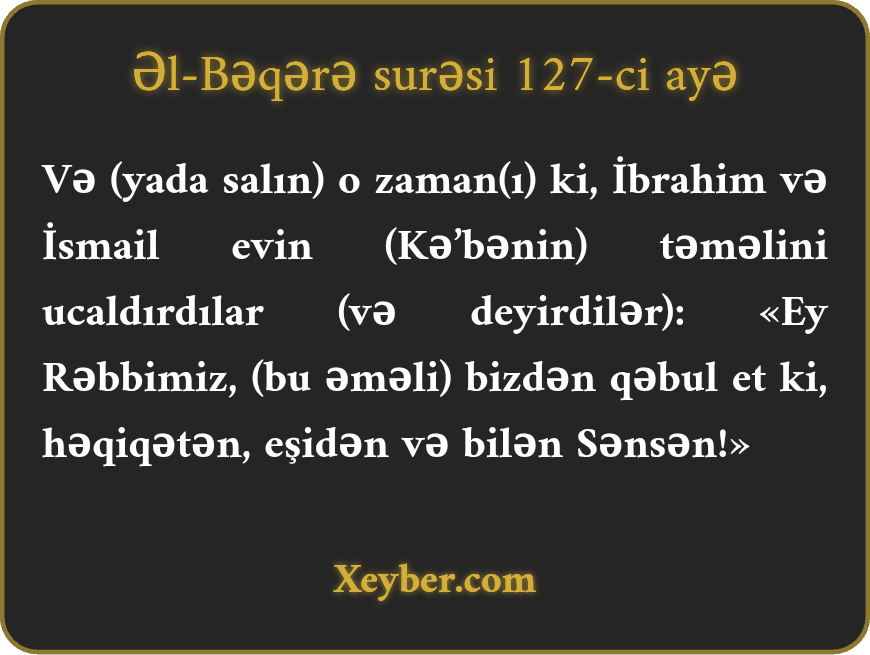 "(Xatırla,) o zaman ki, İbrahim İsmail ilə evin (Kəbənin) sütunlarını yuxarı qaldırırdı. (Və deyirdilər,) Pərvərdigara, bizdən qəbul et. Həqiqətən, Sən eşidən və bilənsən.”