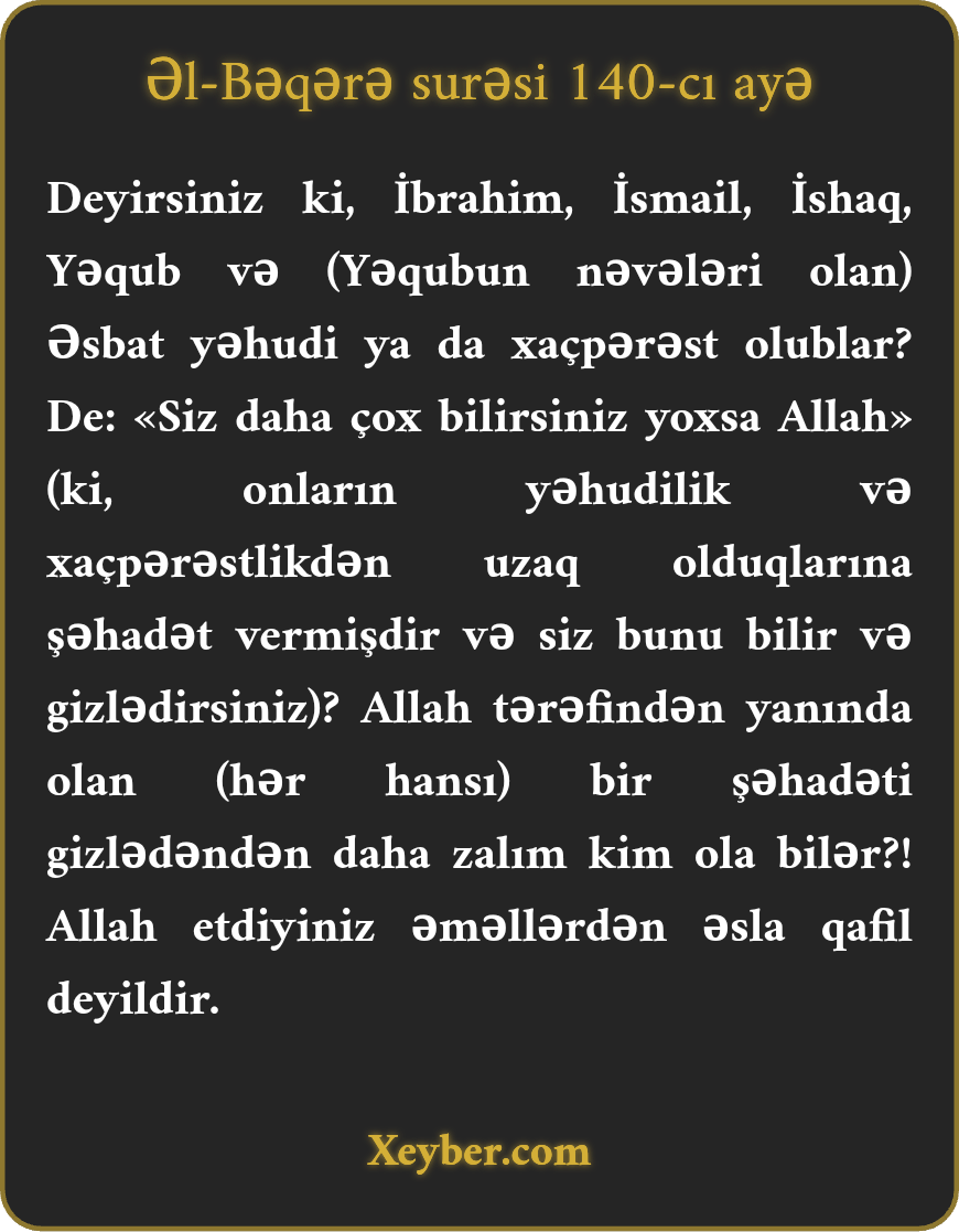 "Yoxsa deyirlər ki, İbrahim, İsmail, İshaq, Yaqub, Əsbat yəhudi və məsihi idilər? De ki, siz yaxşı bilirsiniz, yoxsa Allah? (Nə üçün həqiqəti gizlədirsiniz?) (Peyğəmbərlər haqqında) ilahi and və şəhadəti Allahın yanında ola-ola gizlədəndən də zalımı kimdir? Allah sizin əməllərinizdən xəbərsiz deyil.”