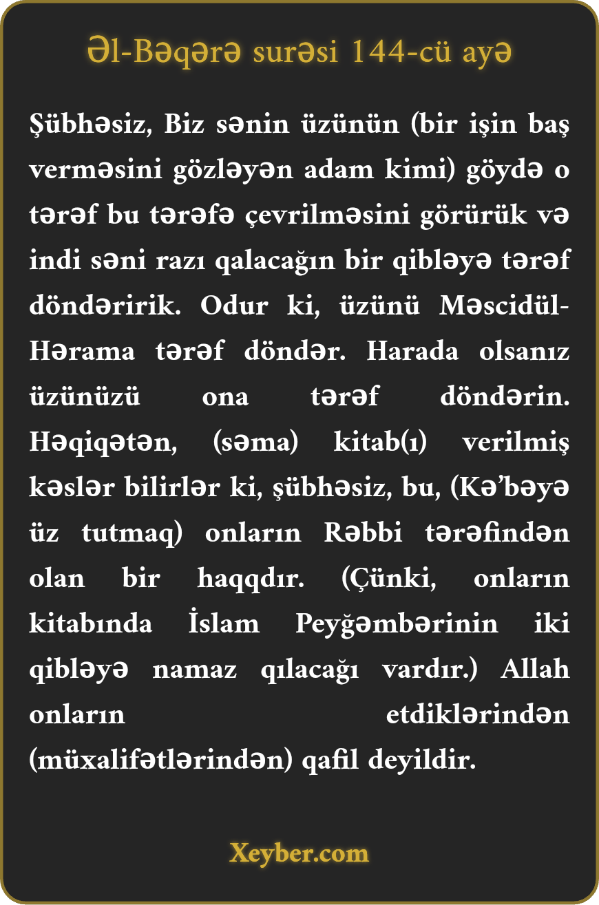 "(Ey peyğəmbər,) görürük ki, (vəhy intizarı ilə) üzünü göyə tutursan. İndi səni könlünü açacaq qibləyə doğru göndəririk. Üzünü Məscidül-Hərama doğru çevir. (Siz ey müsəlmanlar,) harada oldunuz, üzünüzü ona doğru döndərin. (Səmavi) kitab verilmiş şəxslər bilirlər ki, bu əmr Allah tərəfindən gəlmiş bir həqiqətdir. Allah onların əməllərindən qafil deyil.