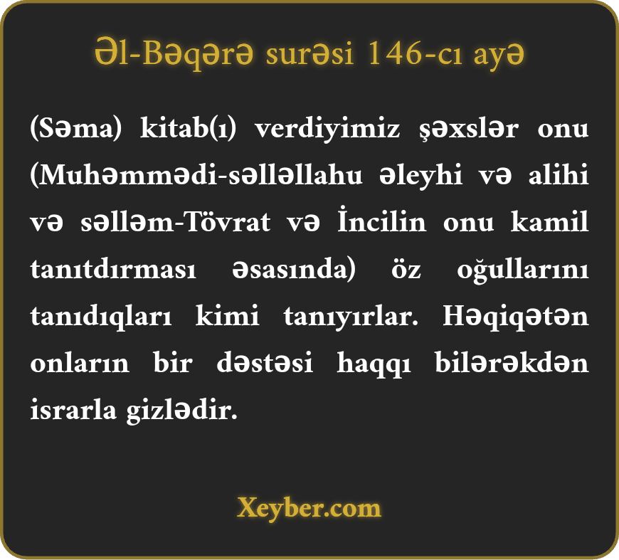 "(Yəhudilər və məsihilər) o kəslərdir ki, onlara (səmavi) kitab vermişik, onu (İslam peyğəmbərini) öz oğlanları kimi tanıyırlar. Həqiqətən, onlardan bir dəstəsi haqqı bilməklərinə baxmayaraq onu gizlədirlər.”
