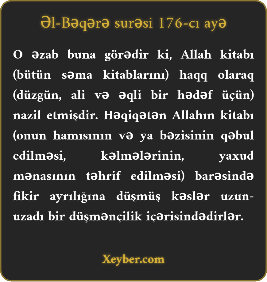 "Bu (əzabın) səbəbi budur ki, Allah (səmavi) kitabı haqq olaraq nazil etmişdir. Əlbəttə, o kəslər ki, kitabda ixtilaf etdilər, daim dərin çəkişmə içindədirlər.”