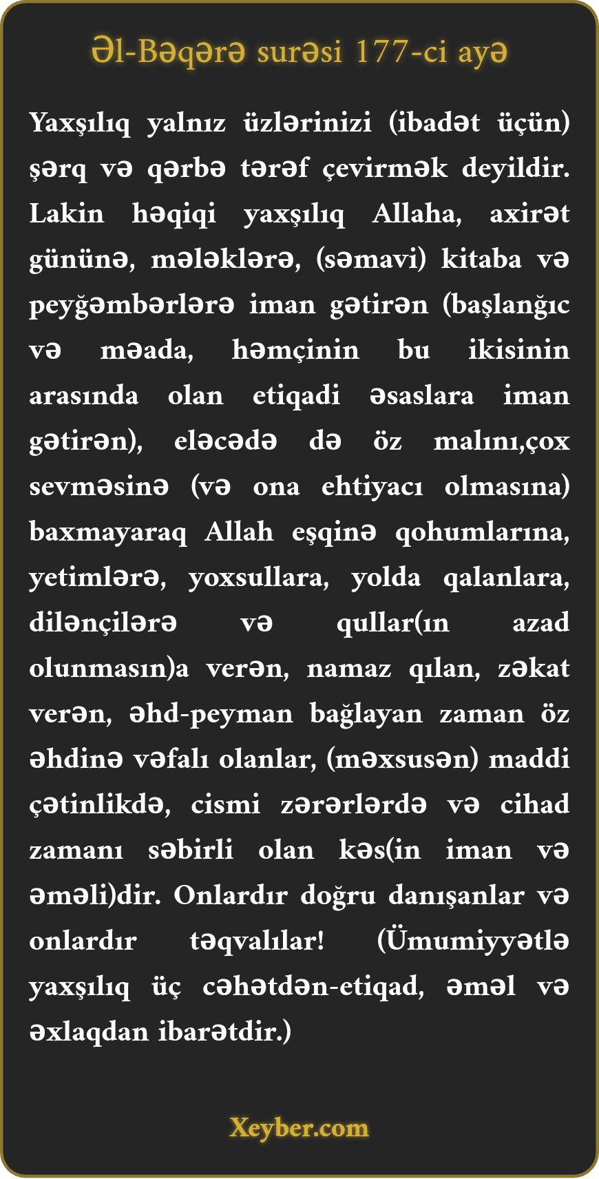 "Yaxşı iş o deyil ki, (namaz zamanı) üzünüzü şərqə və ya qərbə tutasınız. Yaxşı əməl sahibi o kəsdir ki, Allaha, qiyamət gününə, mələklərə, səmavi kitaba və peyğəmbərlərə iman gətirib, malına əlaqəsi olduğu halda onu qohumlara, yetimlərə, biçarələrə, yolda qalmışlara, dilənçilərə versin və qulların azad olunmasında xərcləsin, namaz qılıb zəkat versin. Onlar o kəslərdir ki, peyman bağladıqda əhdlərinə vəfa edər, o kəslərdir ki, çətinliklər, məhrumiyyətlər, xəstəliklər qarşısında, döyüş meydanında sabitqədəm olar və o kəslərdir ki, doğru danışarlar. Və onlar həmin təqvalılardırlar.”