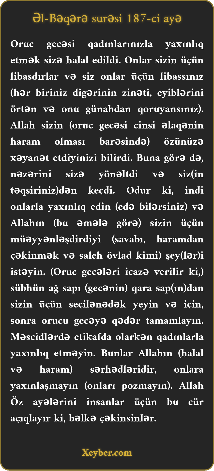 "Oruc gecələri zövcələrinizlə yaxınlıq sizə halal oldu. Onlar sizin, siz isə onların libasısınız. Allah sizin özünüzə xəyanət etdiyinizi bilirdi. (Bəzən qadağan olunmuş yaxınlığa yol verirdiniz). Tövbənizi qəbul etdi, (indi) onlarla yaxınlıq edin. Allahın sizin üçün müəyyənləşdirdiyini tələb edin. Ağ sap qara sapdan seçilənədək yeyin, için. Sonra orucu gecəyədək tamamlayın. Məsciddə mötəkif (oruc ağıza ibadət) olduğunuz vaxt zövcələrinizlə yaxınlıq etməyin. Bu, Allahın hədd və hökmüdür. (Təcavüz və günah məqsədi ilə ona yaxınlaşmayın. Allah öz ayələrini xalqa belə aydınlaşdırır. Bəlkə təqvalı olasınız.”