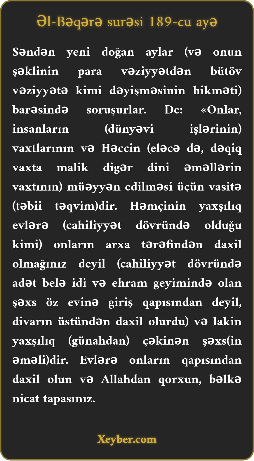 "Səndən ayın hilalları (onların hikməti) haqqında soruşurlar. De ki, bunun səbəbi xalqın vaxtları və həcc zamanını tanımasıdır. (Ey peyğəmbər, onlara de,) yaxşılıq o deyil ki, (həcc ehramı halında) evlərə arxadan daxil olasınız. Yaxşılıq odur ki, təqva yolunu tutasınız və qapılardan daxil olasınız. Allahdan qorxun. Bəlkə nicat tapasınız.”