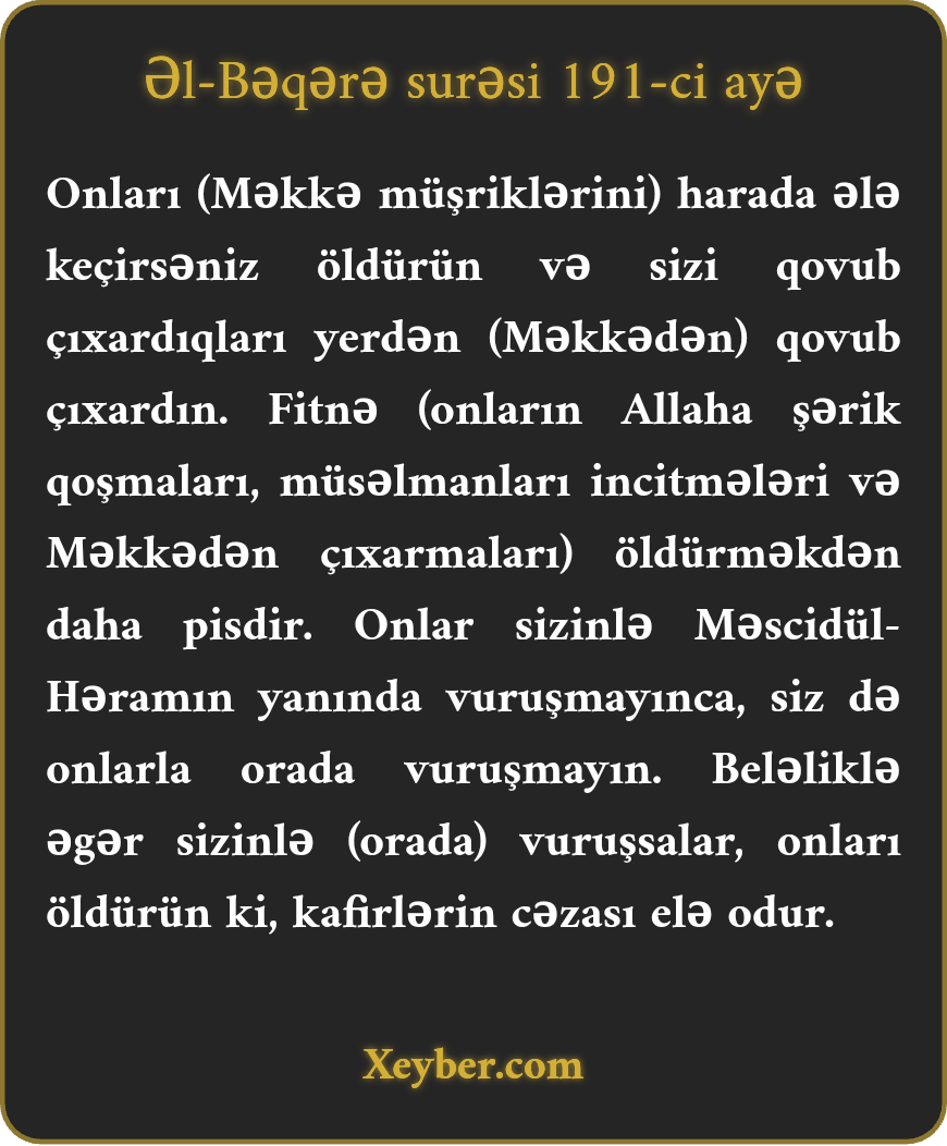 "Onları (heç bir cinayətdən çəkinməyən bütpərəstləri) harada tapsanız öldürün. Və sizi çıxardıqları yerdən (Məkkədən) onları çıxarın. Fitnə (şirk və işkəncə) qətldən pisdir. Məscidül-həramın yanında onlarla vuruşmayın. Bir şərtlə ki, onlar həmin yerdə sizinlə savaşmayalar. Əgər sizinlə savaşsalar, onları (həmin yerdə) qətlə yetirin. Kafirlərin cəzası belədir.”