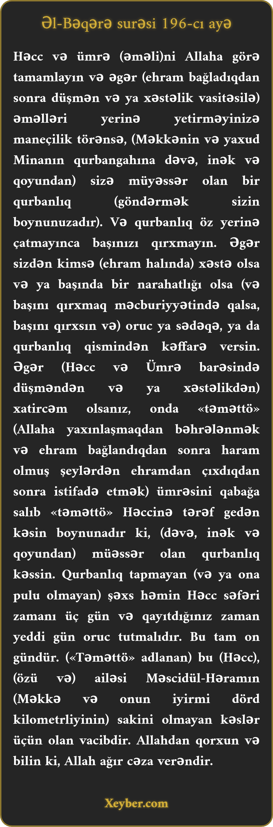 "Həcc və ümrəni Allah üçün sona yetirin. Əgər sizin üçün (düşməndən qorxu, xəstəlik) kimi maneələr olsa, qurbanlıq üçün əliniz çatan şeydən (zibh edin və ehramdan xaric olun.) Qurbanlıq qurbangaha çatanadək başlarınızı qırxmayın və əgər bir şəxs xəstələndi və ya başında bir narahatlıq oldusa, oruc, sədəqə və ya qurbanlıq kimi bir kəffarə yerinə yetirsin. (Xəstəlik və düşməndən) amanda olduğunuz vaxt təməttö ümrə əvəzinə həcci başlayıb, əliniz çatan qurbanlıqdan (kəsin). Qurbanlıq tapmayan isə həcc zamanı üç gün, qayıtdıqdan sonra isə yeddi gün oruc tutsun. Bu on gün kamildir. (Əlbəttə,) bu (təməttö həcci), o kəs üçündür ki, Məscidül-Həramda (Məkkədə) sakin deyil. Allahdan çəkinin və bilin ki, Onun cəzası ağırdır.”