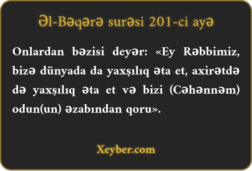 "(Amma) insanların bəziləri deyirlər: "Pərvərdigara! Bizə dünyada da, axirətdə də yaxşılıq mərhəmət buyur və bizi odun əzabından qoru.”