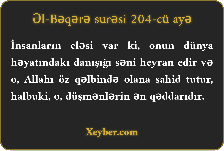 "Xalq arasında eləsi var ki, onun dünya həyatı haqqındakı danışığı səni təəccübləndirir. O, Allahı qəlbinə olan hər şey üçün şahid tutur, (halbuki) o ən qatı düşmənlərdəndir.”