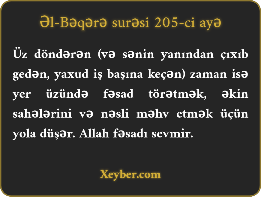 "Əgər qüdrət və hökumətə çatsa, yer üzündə fəsad, əkin sahələrinin və nəslin məhvi üçün çalışar. Allah fəsadı dost tutmur.”