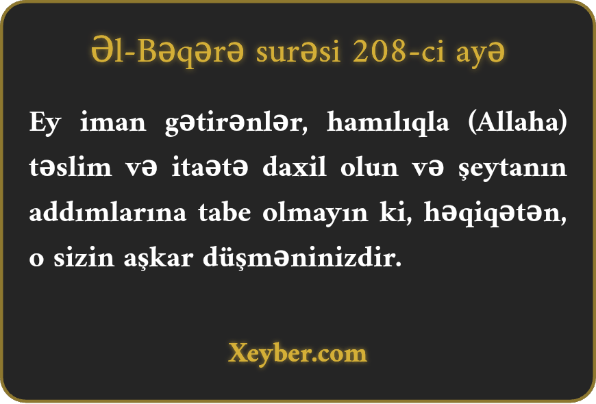 "Ey iman gətirənlər! Hamınız sülhə və barışa gəlin. (Allaha mütləq təslim olun,) Şeytanın addımlarına tabe olmayın ki o, sizin aşkar düşməninizdir.”