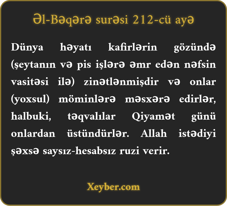 "Dünya həyatı kafirlərin gözündə cilvələnmişdir. Ona görə imanlıları məsxərəyə qoyurlar. Halbuki möminlər və təqvalılar qiyamət günü onlardan üstündürlər. Allah istədiyi kəsə saysız ruzi mərhəmət edir.”