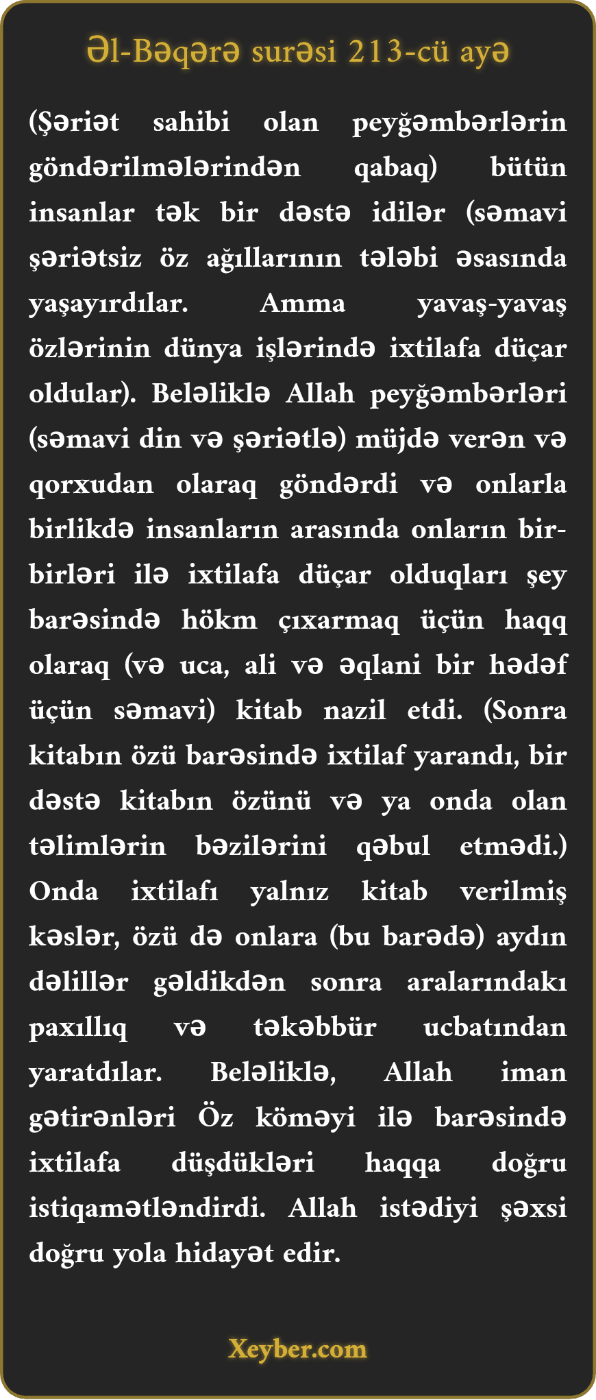 "İnsanlar (başlanğıcda) vahid ümmət və əlbir idilər. (Onların arasında çəkişmə yox idi. İxtilaflar sonradan meydana çıxdı.) Allah peyğəmbərləri müjdə gətirən və qorxudan qərar verdi. Onlara haqq olaraq səmavi kitab nazil etdi ki, xalq arasında ixtilaflı məsələlərdə hökm versinlər. Bu kitaba münasibətdə yalnız həmin kitab göndərilənlər müxaliflik etdilər. Bu da onlara aşkar dəlil gəldikdən sonra baş verdi. (Səbəb) aralarındakı həsəd idi. Allah iman gətirənləri Öz istəyi ilə ixtilaflı məsələlərin həqiqətinə hidayət etdi. (Amma imansızlar hələ də azğınlıq və ixtilafda qalmışlar.) Allah istədiyi kəsi doğru yola hidayət edər.”