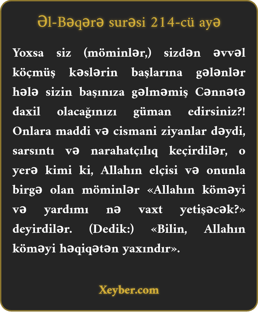 "Keçmişdəkilərin başına gələnlər sizin başınıza gəlməmiş behiştə daxil olacağınızımı güman edirsiniz? Onlar çətinliyə, sıxıntıya düçar olub elə alt-üst oldular ki, peyğəmbər və ona iman gətirib yanında olanlar dedilər: "Allahın yardımı nə vaxt olacaq?” Agah olun ki, Allahın yardımı yaxındadır.”