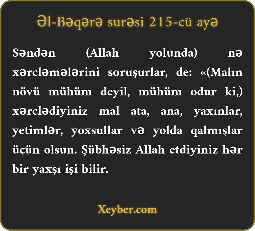 "Səndən soruşurlar ki, nəyi infaq etsinlər? De ki, hər nəyi (istəyirsinizsə) infaq edin, ata-ananız, yaxınlarınız, yetimlər, miskinlər, yolda qalanlar üçün olsun. (Bilin ki,) gördüyünüz hər bir xeyir işdən, həqiqətən, Allah xəbərdardır.”