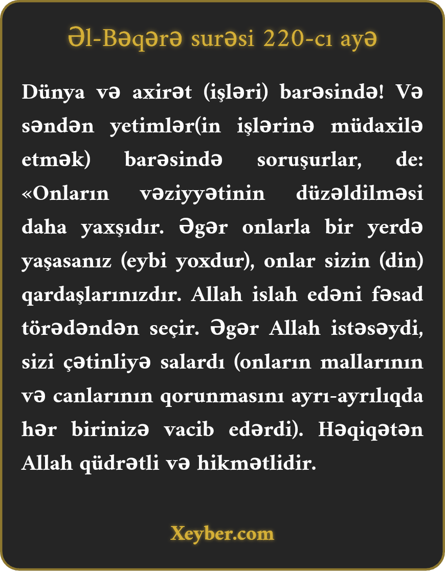 "(Düşünün) dünya və axirət haqqında. Səndən yetimlər haqqında soruşarlar. De ki, onların işlərini yoluna qoymaq yaxşıdır. Əgər öz həyatınızı onların həyatından ayırmasanız (eybi yoxdur), onlar sizin (din) qardaşlarınızdır. Allah islah əhlini fəsad əhlindən ayırd edir. Allah istəsəydi sizi zəhmətə salardı. (Göstəriş verərdi ki, yetimlərə himayədarlıq edərkən onların malını öz malınıza qatmayasınız. Amma Allah belə etmir.) Həqiqətən, O, əziz və həkimdir.”