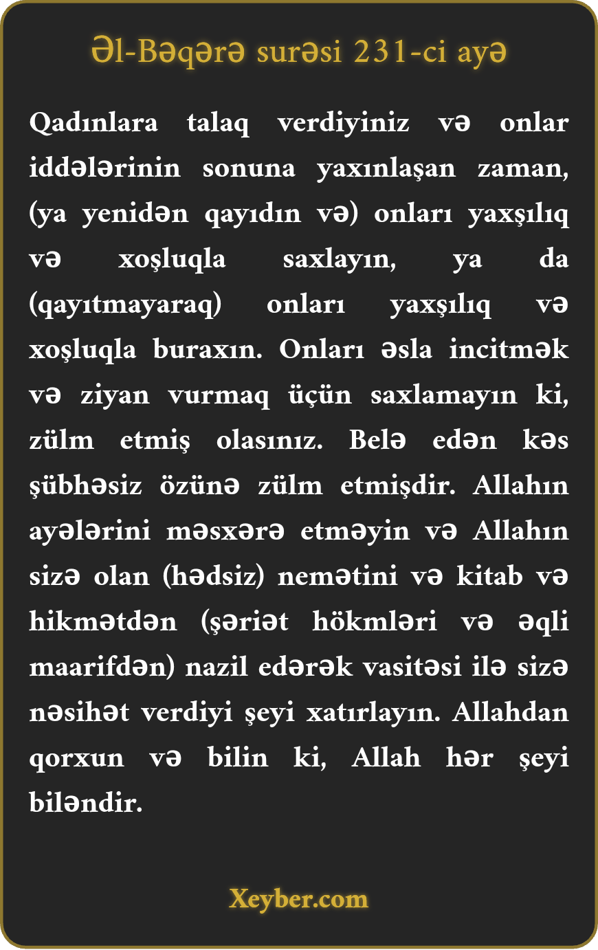 "Qadınlarınıza talaq verdikdə və möhlət ("iddə”) başa çatdıqda, ya onları layiq olduqları tərzdə saxlayın, ya da bəyənilmiş şəkildə azad edin. Onları əziyyət vermək üçün saxlamayın ki, təcavüz edəsiniz. Belə edən şəxs özünə zülm edib. Allahın ayələrini məsxərəyə qoymayın. Allahın sizə verdiyi neməti, öyüd üçün nazil etdiyi səmavi kitabı və hikməti xatırlayın. Allahdan qorxun və bilin ki, Allah hər şeydən xəbərdardır.”