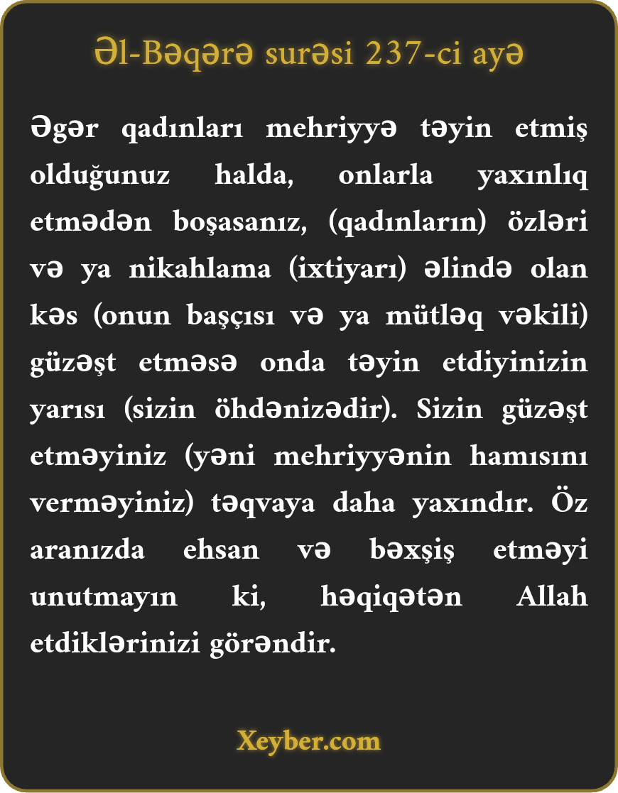 "Mehriyyə təyin etdiyiniz qadınları onlarla yaxınlıq etməmiş boşasanız, təyin etdiyinizin yarısını onlara verin. Onlar (öz haqlarını) bağışlasalar bu ayrı. Ya da izdivac əqdi əlində olan kəs onu bağışlasın. Əgər bağışlasanız, (onların bütün mehrini ödəsəniz), bu iş təqvaya daha yaxındır. Öz aranızda yaxşılığı unutmayın ki, həqiqətən, Allah etdiyiniz işləri görəndir.”