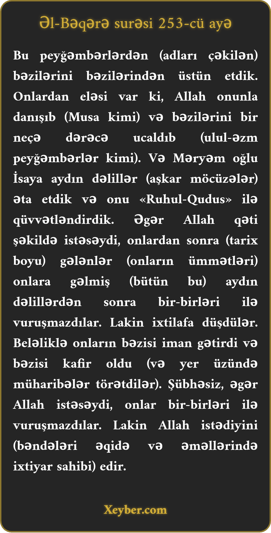 "O peyğəmbərlərin bəzisini bəzilərindən üstün etdik. Onlardan eləsi oldu ki, Allah onunla danışdı və bəzilərinin dərəcəsini yuxarı qaldırdı. Məryəm oğlu İsaya aşkar nişanələr verdik, onu Ruhul-qüdslə (Cəbraillə) gücləndirdik. Allah istəsəydi, onlardan (peyğəmbərlərdən) sonrakılar aşkar dəlil gəldikdən sonra bir-birləri ilə savaşa qalxmazdılar. (Amma Allah xalqı yol seçimində azad buraxmışdır.) Amma onlar bir-birləri ilə ixtilaf etdilər. Bəziləri iman gətirdi, bəziləri kafir oldu. Allah istəsəydi, (möminlər və kafirlər) savaşa qalxmazdılar. Amma Allah istədiyini yerinə yetirir.