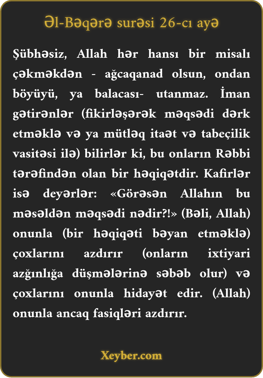 "Həqiqətən, Allah ağcaqanadı və ya ondan da böyüyünü misal gətirməkdən çəkinməz. İman gətirənlər bunun Rəbbləri tərəfindən bir həqiqət olduğunu bilirlər. Kafirlər isə deyirlər: "Allah bu məsəllə nə demək istəyir? Allah bu məsəllə bir çoxlarını yoldan azdırır, bir çoxlarını isə doğru yola hidayət edir. Allah günahkar fərdlərdən başqasını azdırmaz.”