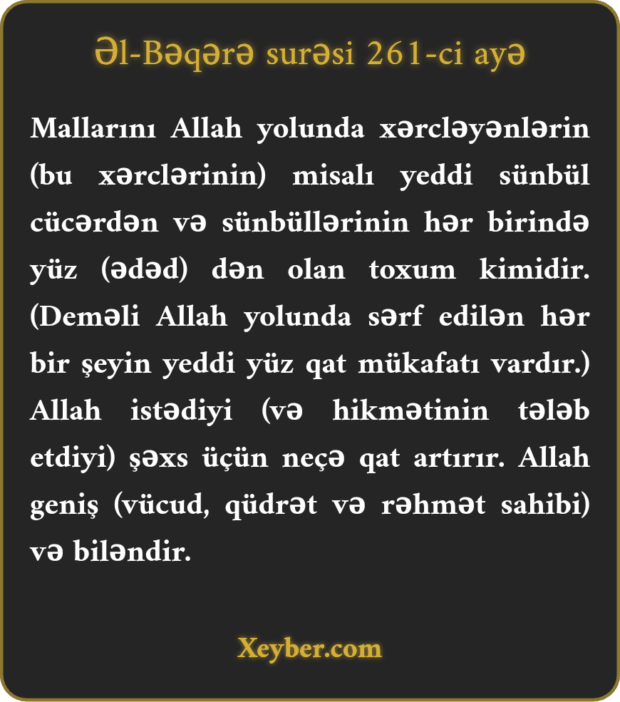 "Öz malını Allah yolunda infaq edənlər yeddi sünbül cücərdən toxuma bənzər. Hər sünbüldə yüz dən olar. Allah onu istədiyi kəs üçün ikiqat və ya neçə qat edər. Allah (qüdrət və rəhmət baxımından) genişdir və biləndir.”