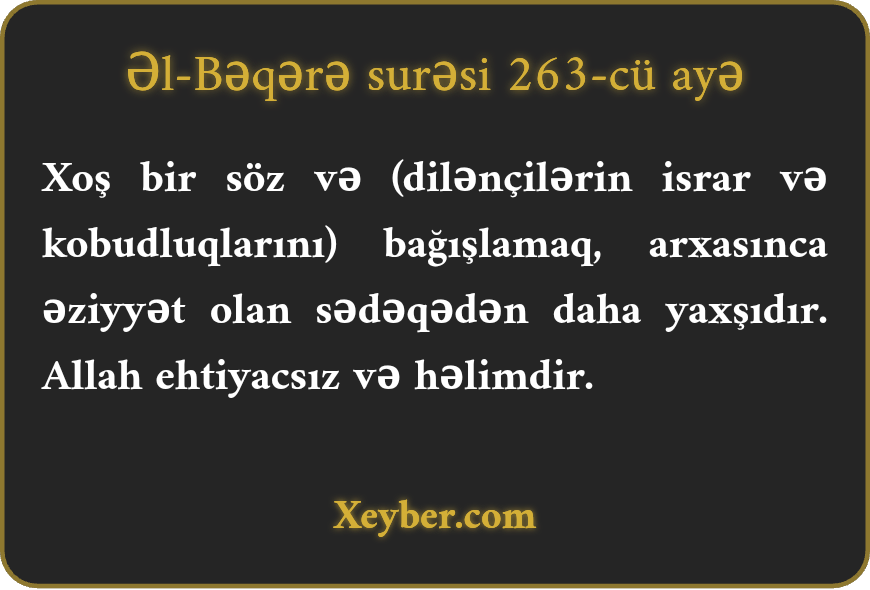 "(Ehtiyaclılarla) xoş danışıq və onları bağışlamaq əziyyətlə müşayiət olunan bəxşişdən üstündür. Allah ehtiyacsız, həlimdir.”