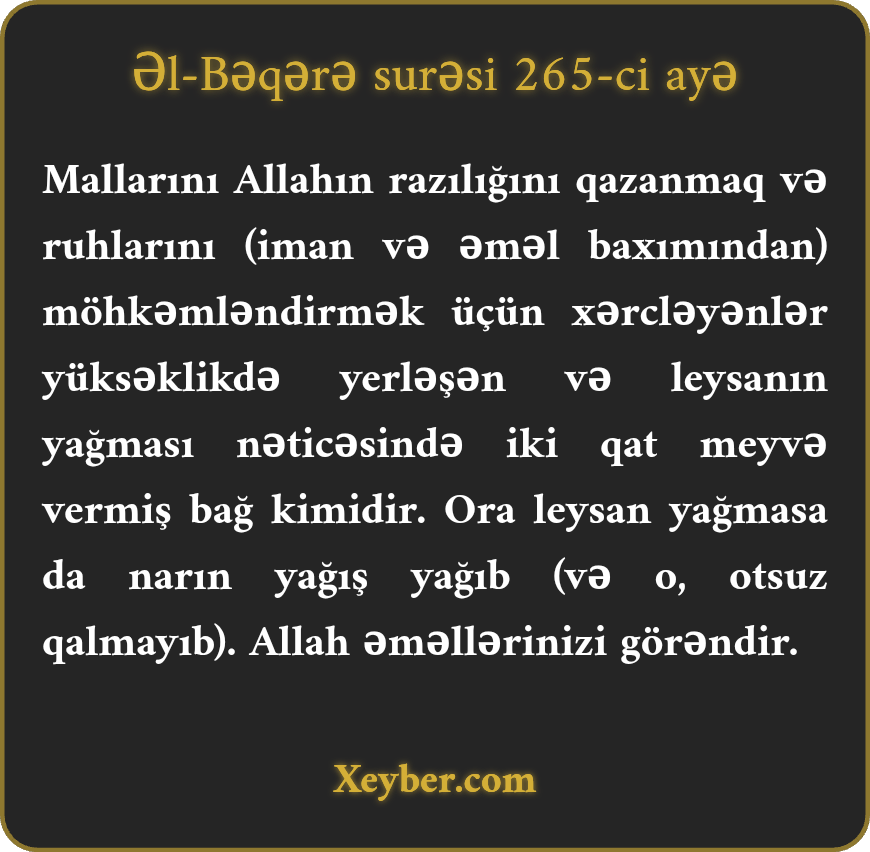 "Mallarını Allahın razılığı və öz ruhlarının möhkəmliyi yolunda infaq edənlər uca bir nöqtədə olan (saf havadan qədərincə bəhrələnən), gur yağışların suvardığı, iki qat artıq meyvə verən bağa bənzərlər. Əgər yağış gur yağmasa, sısqa yağar, şəbnəm olar (bağ daim təravətli qalar.) Allah etdiyiniz işləri görəndir.”