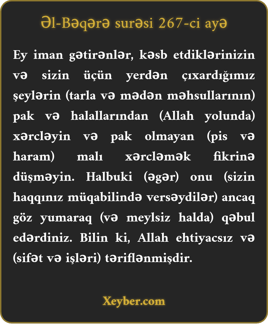 "Ey iman gətirənlər! Əldə etdiyiniz pak şeylərdən və Bizim sizin üçün torpaqdan cücərtdiklərimizdən infaq edin. İnfaq üçün pak olmayan şeylərin sorağınca getməyin. Axı siz özünüz də həmin şeyləri qəbul etməyə hazır deyilsiniz - yalnız çarəsizlikdən və ikrahla qəbul edərsiniz. Bilin ki, Allah ehtiyacsız və həmd olunmuşdur.”