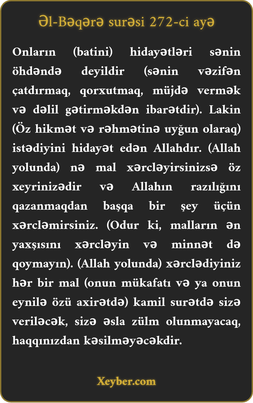 "İnsanların hidayəti sənin öhdənə deyil. Allah istədiyini hidayət edir. Yaxşılıqlardan infaq etdiyiniz öz xeyirinizədir. Allahın razılığından başqa şey üçün infaq etməyin. Yaxşı infaqlarınızın əvəzi tam şəkildə sizə veriləcəkdir. Sizə zülm edilməyəcək.”