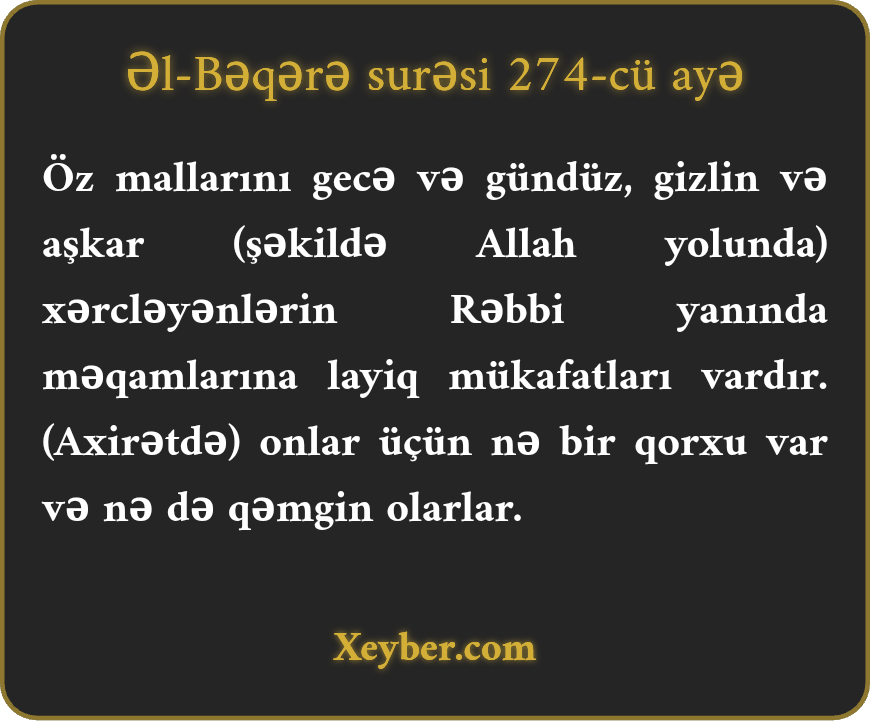 "Öz mallarını gecə və gündüz, gizlində və aşkarda infaq edənlərin mükafatı Allahın yanındadır. Onlar üçün nə bir qorxu var, nə də qəmgin olarlar.”