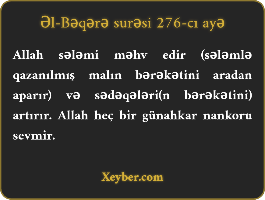 "Allah sələmi puç edir, amma sədəqəni artırır. Allah heç bir naşükürü və günahkar kafiri xoşlamır.”