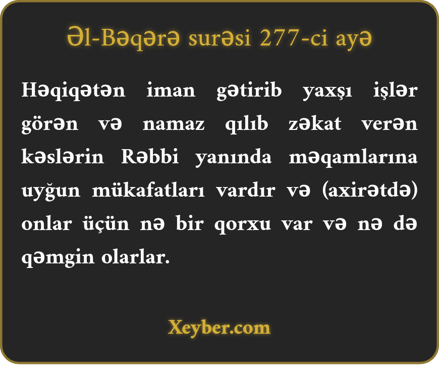 "Həqiqətən, iman gətirib yaxşı iş görənlər, namaz qılıb zəkat ödəyənlərin mükafatı Allahın yanındadır. Onlar üçün nə qorxu var, nə də qəmgin olarlar.”