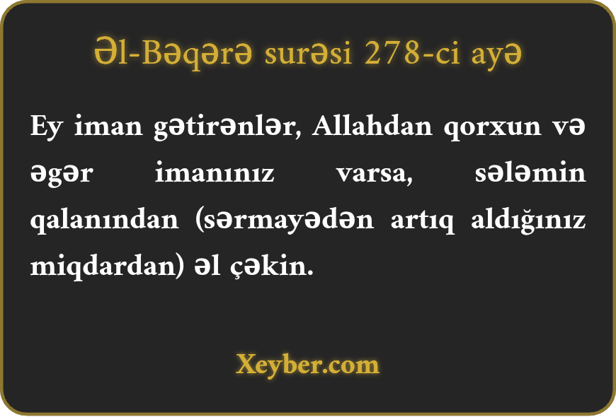 "Ey iman gətirənlər! İlahi təqva yolunu tutun. Sələmdən qalanı (borcları) boşlayın. Əgər iman gətirmisinizsə!”