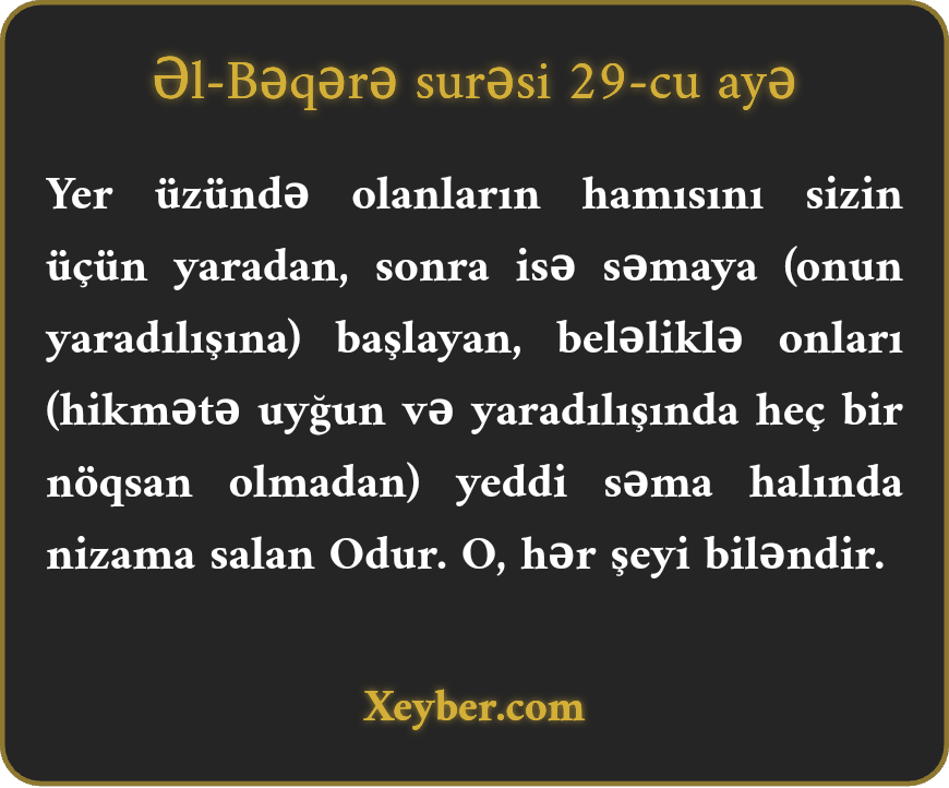 "Yerdə olanları bütünlüklə sizin üçün yaradan, sonra səmanı yaratmağa başlayıb, oları yeddi səma şəklində möhkəmlədən Odur. O hər şeydən agahdır.”