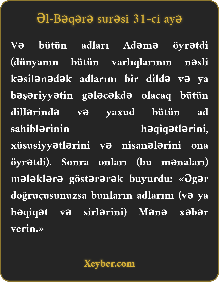 "Allah bütün adları Adəmə öyrətdi. Sonra onları mələklərə təqdim edərək buyurdu: "Əgər doğru deyirsinizsə onların adlarını Mənə xəbər verin.”
