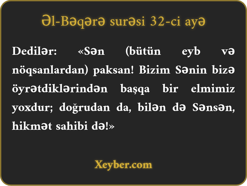"Mələklər dedilər: "Pərvərdigara! Sən pak və münəzzəhsən. Biz Sənin bizə öyrətdiklərindən başqa bir şey bilmirik. Həqiqətən, Sən həkim (hikmət sahibi) və bilənsən.”
