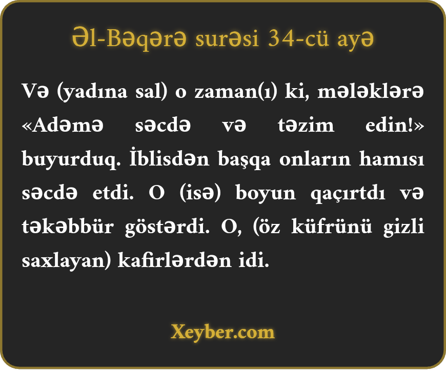 "Mələklərə "Adəmə səcdə edin” dediyimiz vaxt İblisdən başqa hamısı səcdə etdi. İblis boyun əyməyib təkəbbürlük göstərdi və kafirlərdən oldu.”