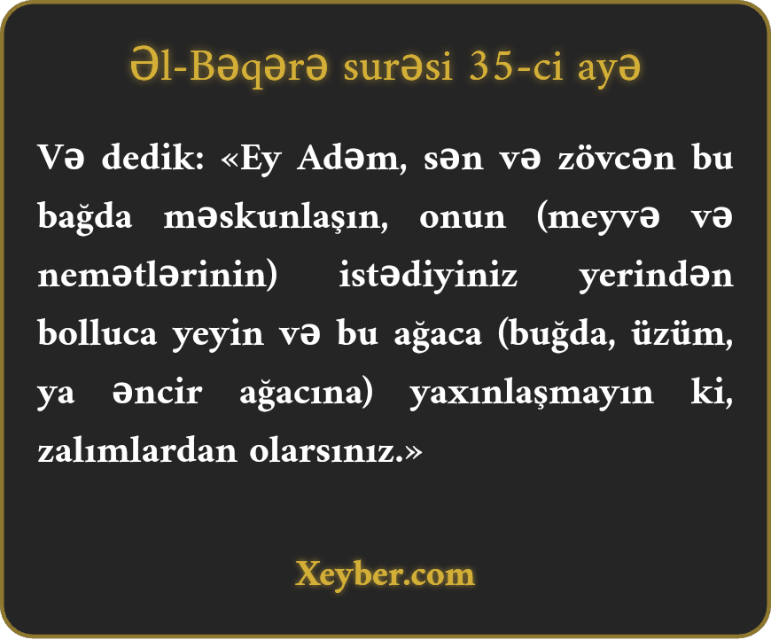 "Dedik: Ey Adəm! Sən öz zövcənlə bu bağda sakin ol və hər ikiniz istədiyiniz kimi oradakı meyvələrdən bol-bol yeyin. Yalnız bu ağaca yaxın gəlməyin. Yoxsa özünüzə zülm edənlərdən olacaqsınız.”
