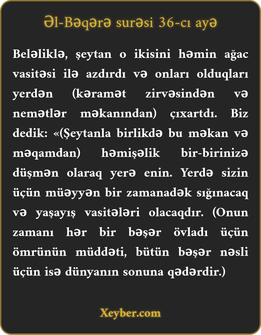"Beləcə şeytan o iki nəfəri büdrədib, nemətlər içində olduqları yerdən uzaqlaşdırdı. Biz də dedik: "Bir-birinizə düşmən kəsilərək buradan kənar olub, yer üzünə enin. Yerdə sizin üçün müəyyən vaxta qədər sığınacaq və yaşayış vasitələri var”.