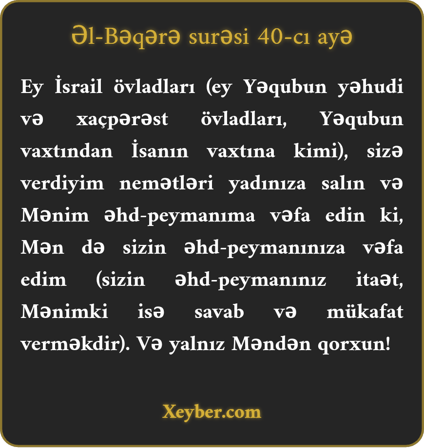 "Ey İsrail övladları! Sizə ruzi etdiyim nemətləri yadınıza salın və əhdimə vəfa edin ki, Mən (də) sizin əhdinizə vəfa edim. Yalnız Məndən qorxun!”