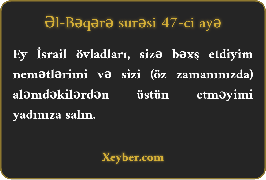 "Ey Bəni-İsrail! Sizə ruzi etdiyim nemətləri yada salın və bunu ki, Mən sizə dünyadakılardan üstünlük verdim.”