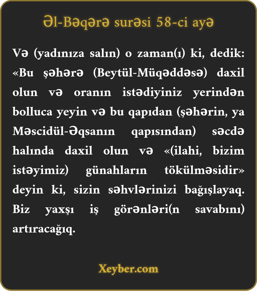 "(Yada salın) O zaman ki, dedik: "Bu kəndə (Beytül-Müqəddəsə) daxil olun və onun bol nemətlərindən nə istəyirsinizsə, ləzzətlə yeyin. Qapıdan (Beytül-Müqəddəs məbədi) səcdə edən və xaşe halda daxil olun və deyin: "Hittə” (günahlarımızı tök), Biz də sizin xətalarınızı bağışlayaq. Biz yaxşı əməl sahiblərinə artıq əvəz verəcəyik.”