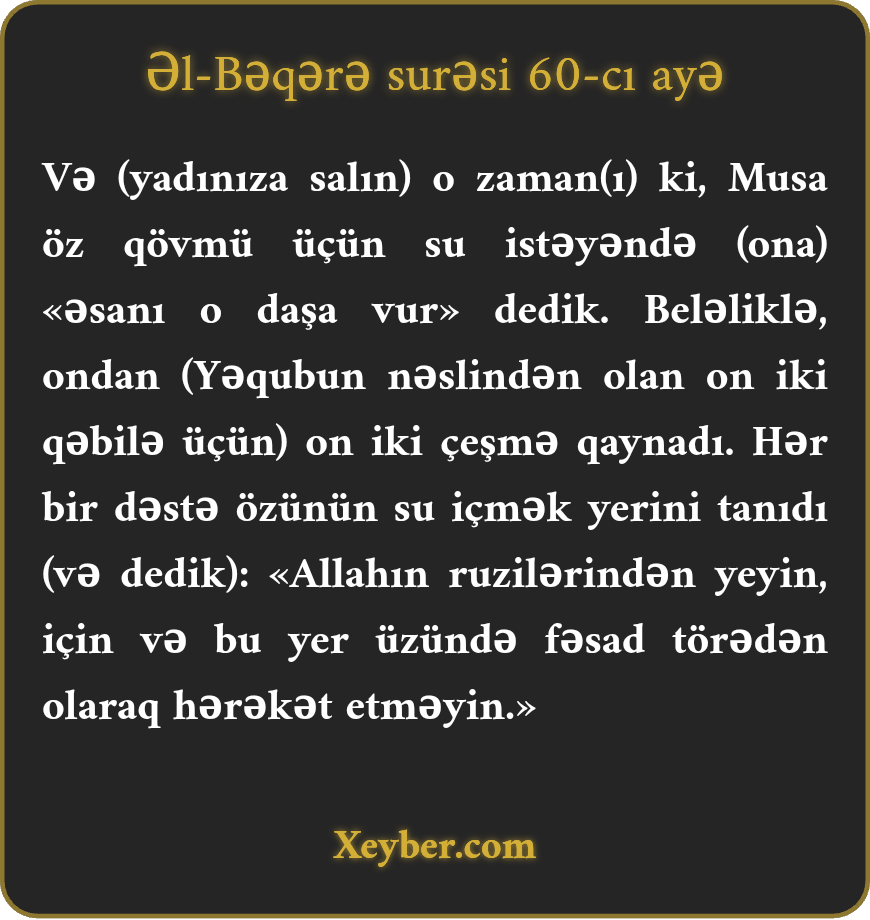 "(Yadınıza salın) o zaman ki, Musa öz qövmü üçün su istədi, ona dedik: "Öz əsanı daşa vur.” Qəfildən ondan on iki çeşmə yarıldı və qaynadı. Fərdlərdən hər biri su içəcəyi yeri tanıdı. (Dedik) İlahi ruzidən yeyin-için və yer üzündə təkəbbürlə fəsad göstərməyin.”
