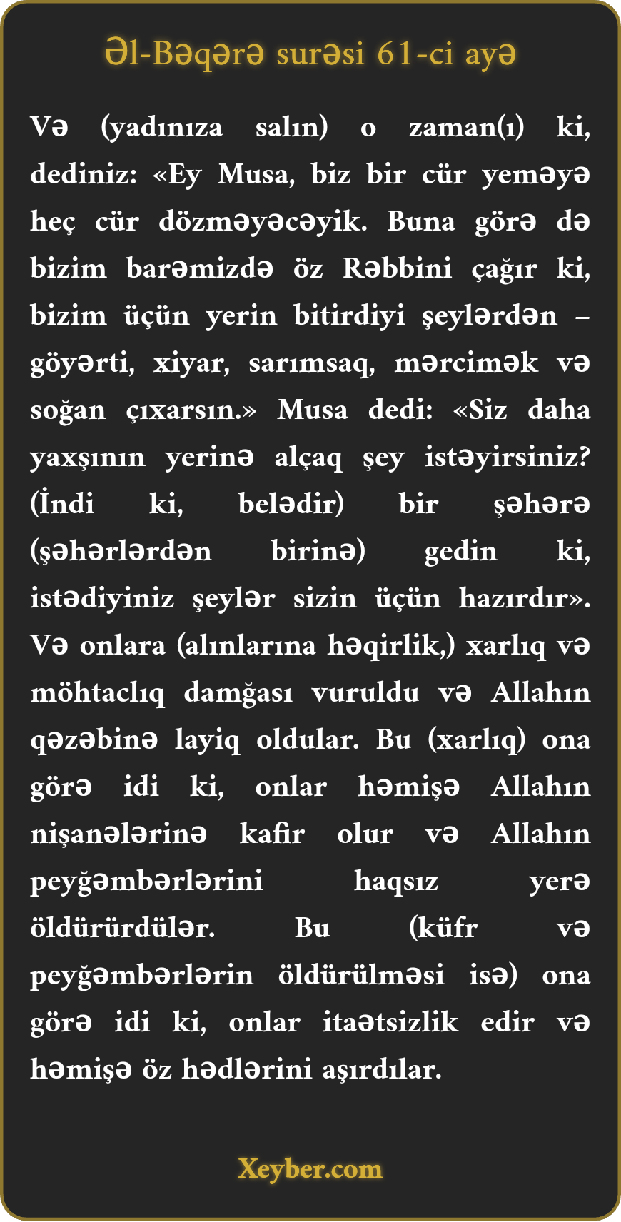 "(Xatırlayın) O zaman ki, dediniz: "Ya Musa, biz hər gün eyni təam yeməyə dözməyəcəyik. Rəbbindən istə ki, bizim üçün torpağın bitirdiyi şeylərdən - tərəvəzdən, xiyardan, sarımsaqdan, mərcidən və soğandan yetirsin.” Musa dedi: " Siz yaxşı nemətin əvəzində bu cür alçaq şeylərmi istəyirsiniz? Belədirsə, şəhərə daxil olun, istədiyinizi orada taparsınız. "Onlara zəlalət və möhtaclıq damğası vuruldu. Allahın qəzəbinə düçar oldular. Bunun səbəbi onların Allah ayələrini inkar etmələri, peyğəmbərləri haqsız yerə öldürmələri idi. Bunun səbəbi onların günahkarlığı, asiliyi və həddi aşmaları idi."