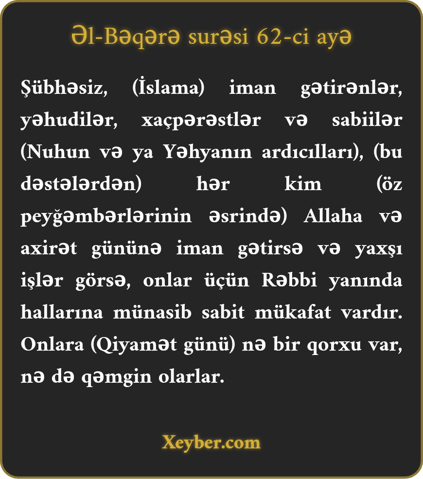 "O kəslər ki, iman gətirdilər və o kəslər ki, yəhudi, məsihi və sabii oldular, Allaha və qiyamət gününə iman gətirib saleh iş görsələr, mükafatları Rəbblərinin yanındadır. Onlar üçün qorxu yoxdur və onlar qəmgin olmazlar.”